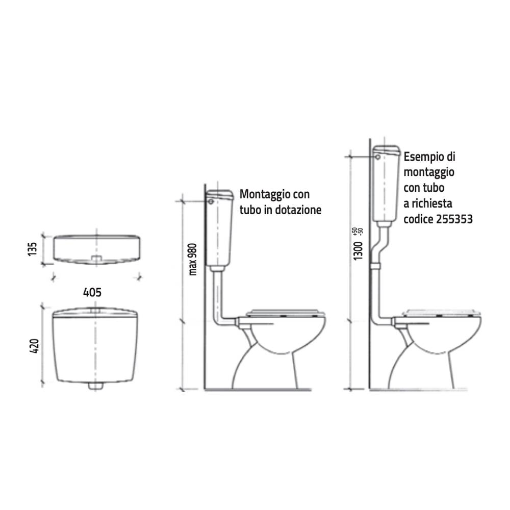 Dotazione di serie: Kit accessori per il fissaggio alla parete, Tubo di scarico, Guarnizioni di collegamento, Dima di montaggio. Note tecniche: Cassetta di risciacquo WC per installazioni a bassa o media posizione. Scocca in ABS con trattamento anti invecchiamento. Capacità 9 lt con possibilità di regolazione a 6 lt. Coibentazione anticondensa ed insonorizzante. Allacciamento idrico laterale dx/sx. Galleggiante Norma rumorosità inferiore 12db. Tasto centrale a scarico totale.
