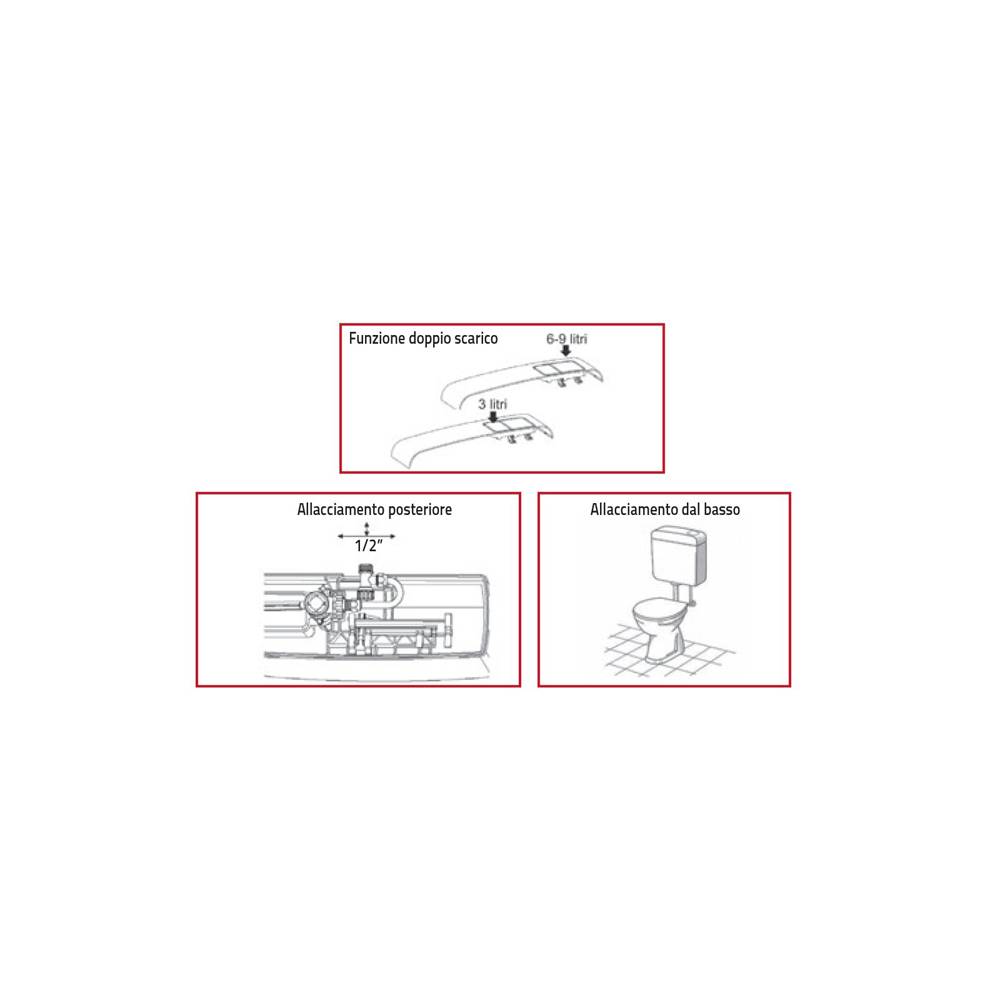 Dotazione di serie: Kit accessori per il fissaggio alla parete, Tubo di scarico, Guarnizioni di collegamento, Dima di montaggio Note Tecniche: Cassetta di risciacquo WC per installazioni a bassa o media posizione. Scocca in ABS con trattamento anti invecchiamento. Capacità 9 lt con possibilità di regolazione a 6 lt. Coibentazione anticondensa ed insonorizzante. Allacciamento idrico laterale dx/sx e posteriore al centro. Galleggiante Norma rumorosità inferiore 12db. Comando a doppio flusso di scarico 3,6/6,9 lt. Sistema innovativo di ulteriore regolazione dello scarico parziale dal 3,5 lt standard fino ad un minimo di 1 lt.