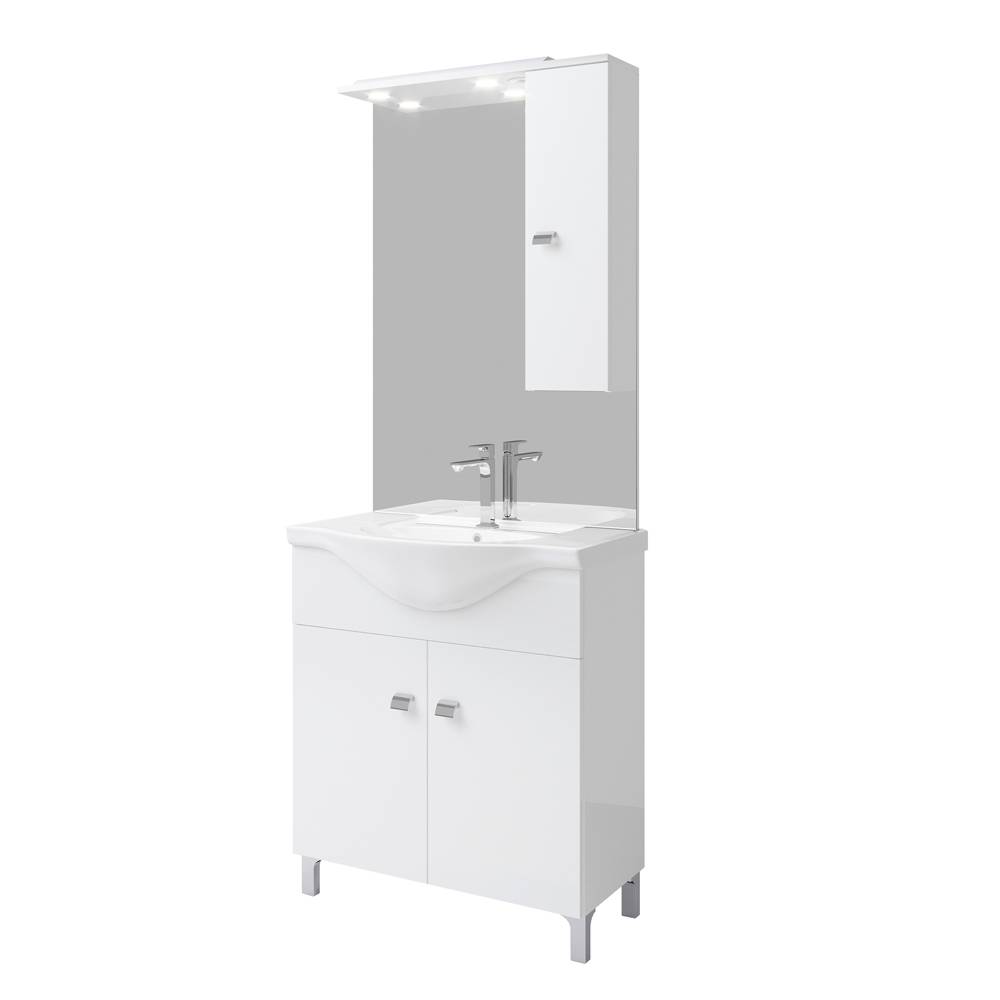 Composizione composta da: - Base a terra 75 cm con 2 ante; - Lavabo in ceramica 75 cm; - Specchiera 70x103,6 cm con pensile Destro e 2 faretti a LED. Dimensioni: L.75 x H. 88,5 x P. 51,5 cm. Frontale in MDF rivestito in PVC con pellicola di protezione, laterali laccati UV.