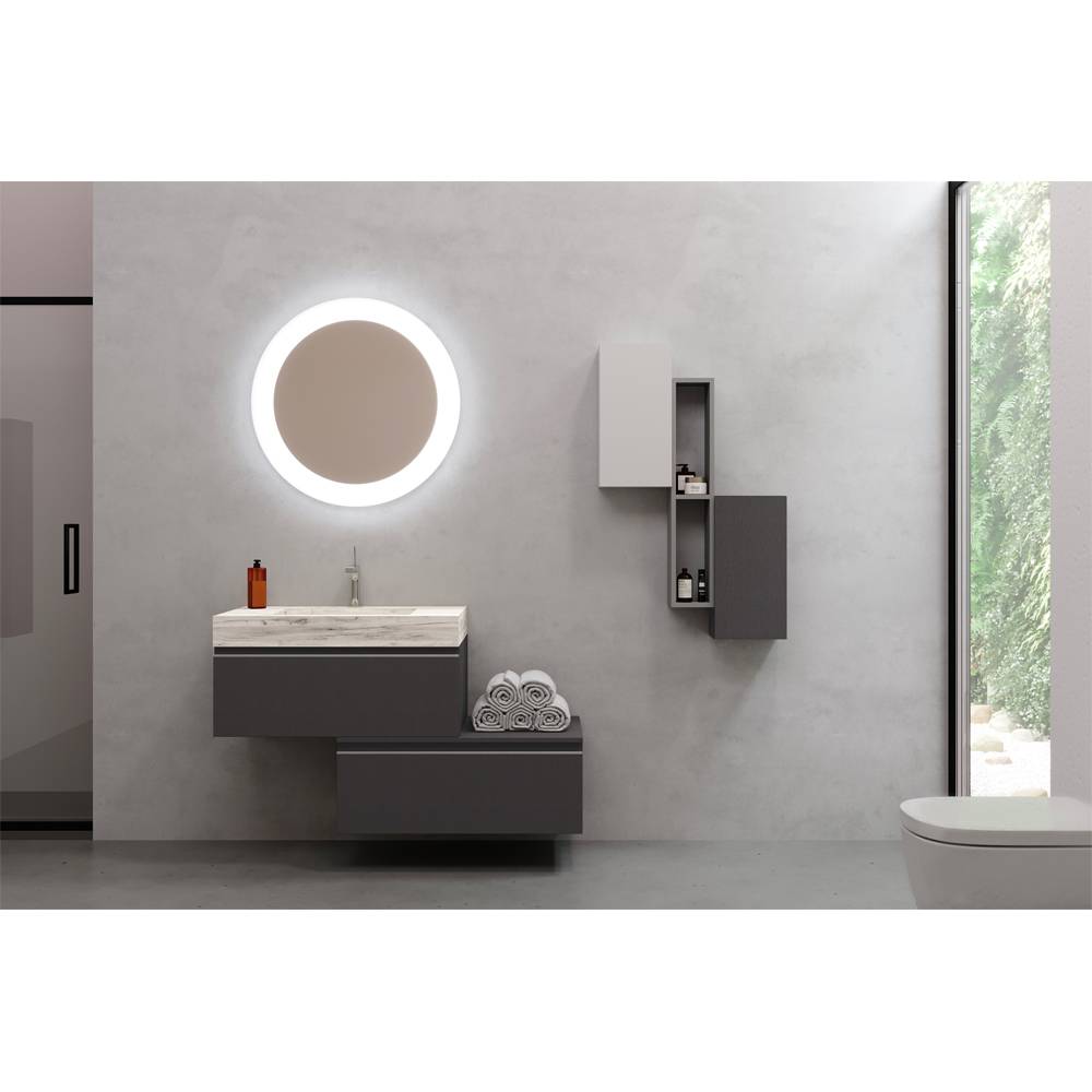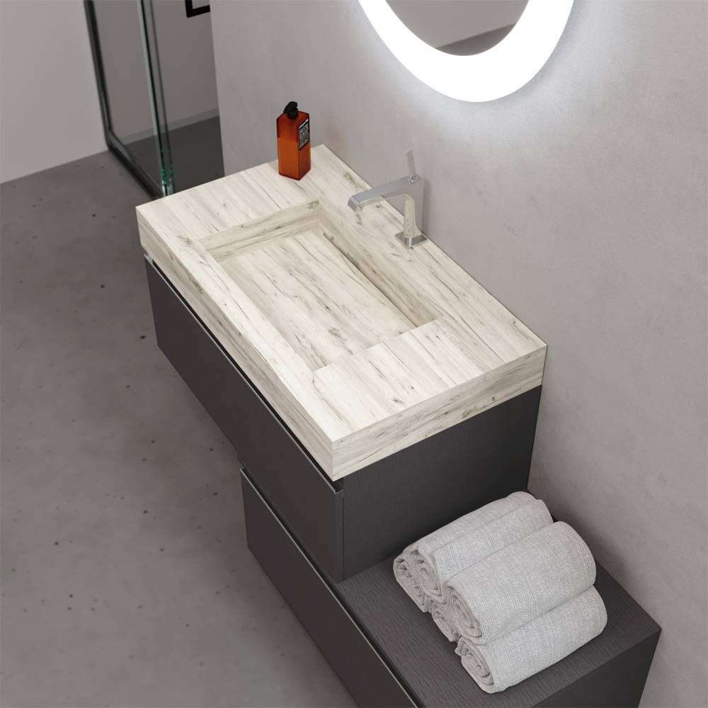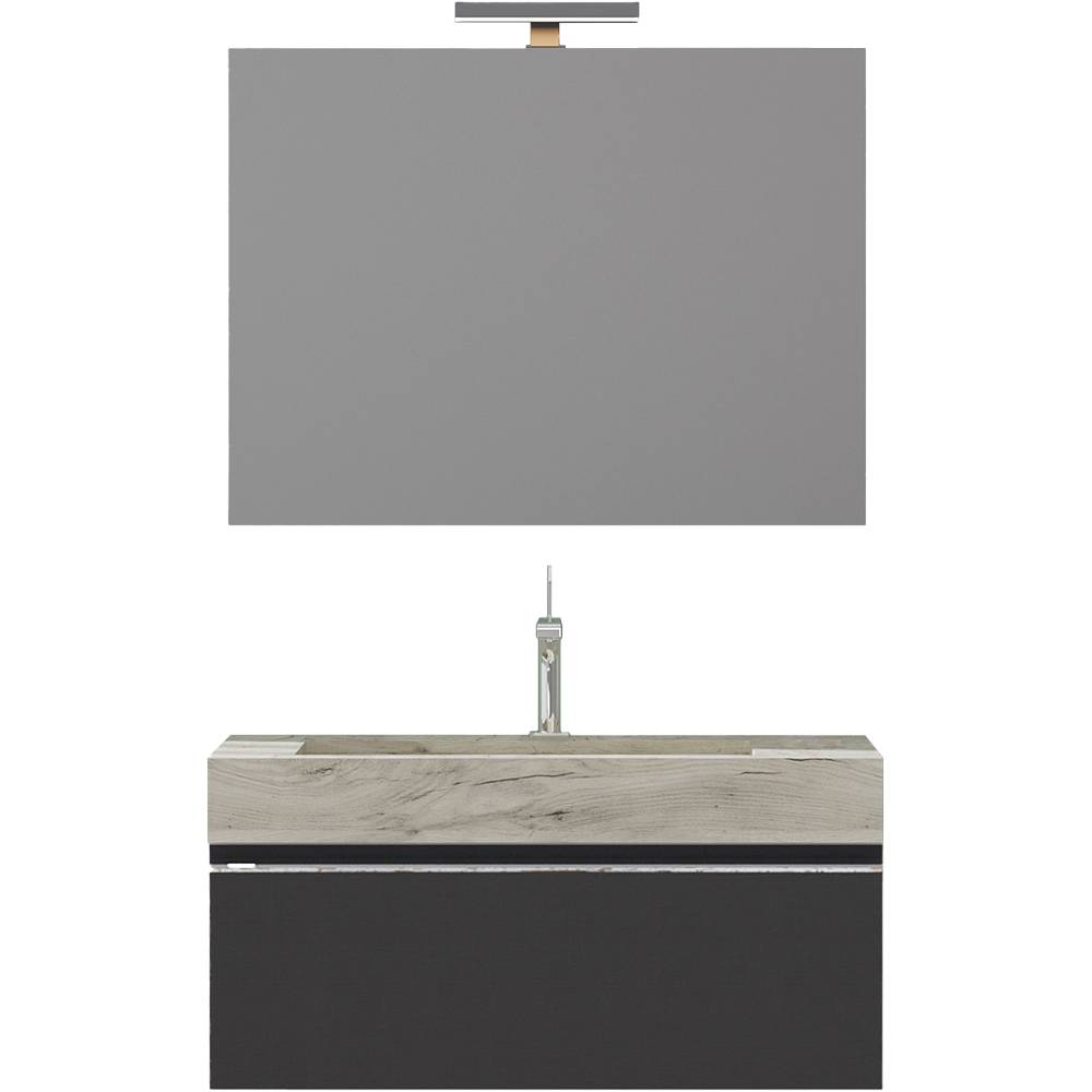 Composizione composta da: - Base sospesa da 80 cm con 1 cassetto finitura Lino; - Lavabo in HPL con scarico a scomparsa; - Specchio filo lucido 80x65,3 cm - Lampada a LED. MDF rivestito in PVC colore LINO. Cassetti interni in metallo ad estrazione completa con chiusura rallentata, maniglie in metallo cromata. Con possibilità di abbinarla ai nostri cassetti "ALBATROS" presenti a pagina 181.