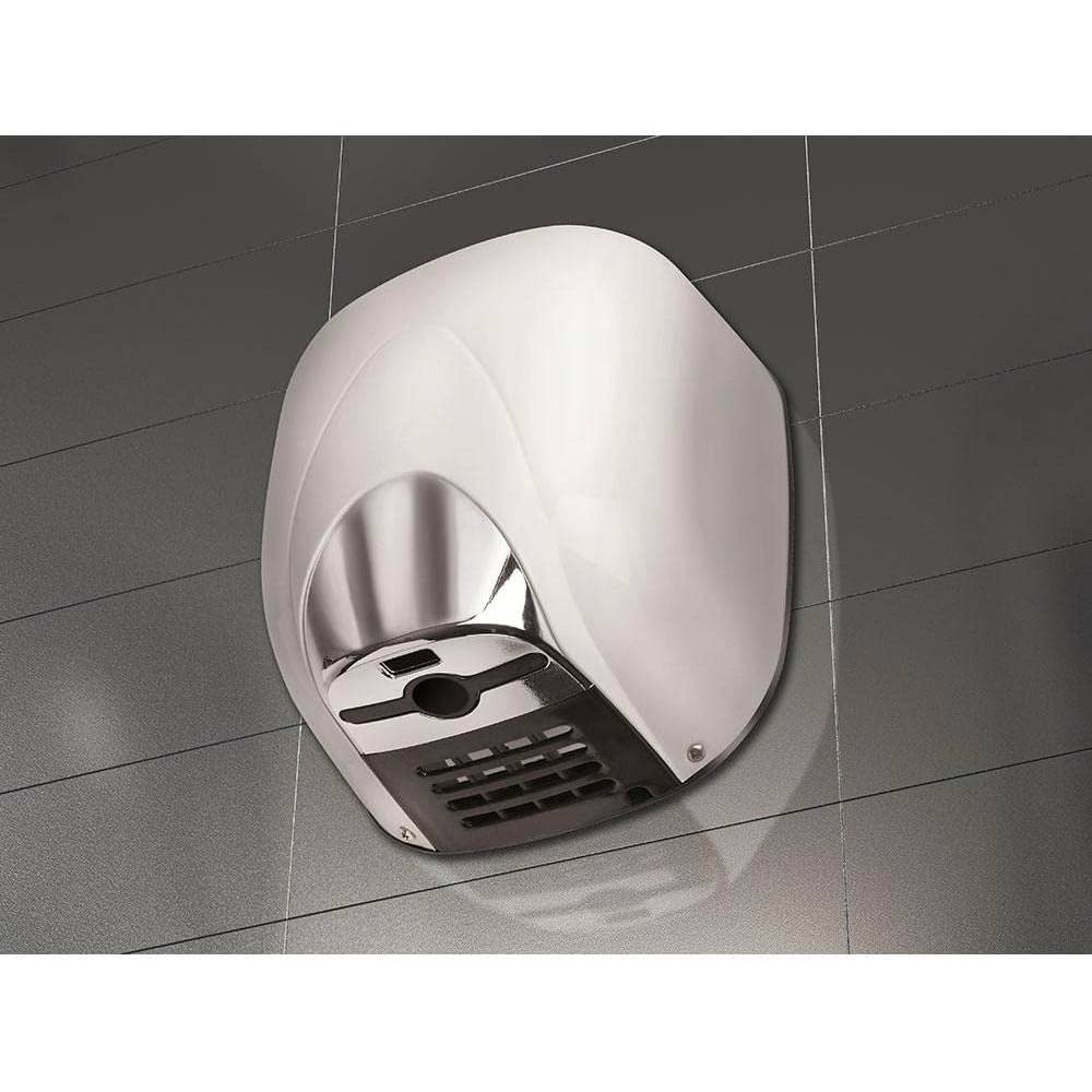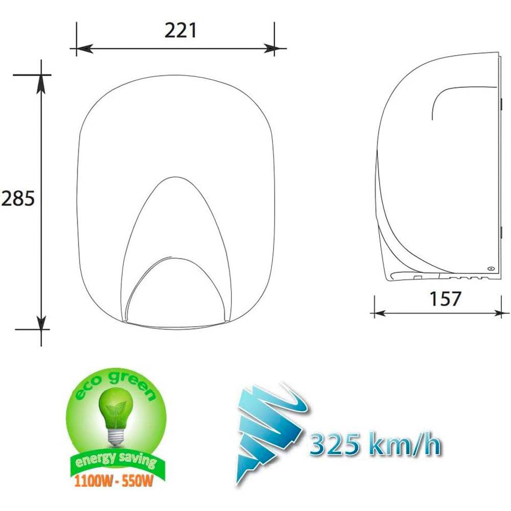 Aria calda immediata. Motore 550W. Resistenza 550W. Asciugamani eco-jet ideale per ambienti ad elevata frequenza d'uso: tempo di asciugatura 15 sec. con assorbimento di soli 1100W.