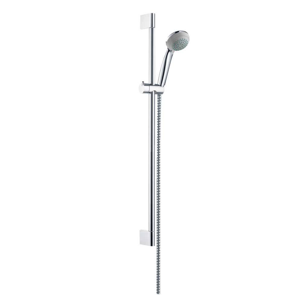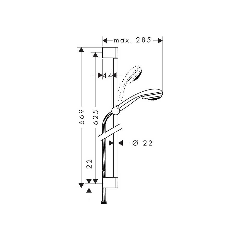 Composto da: - Asta doccia; - Flessibile doccia; - Cursore; - Doccetta diametro 85 mm; - Getto normale, tipo Vario, getto regolabile tramite levetta selettrice; Portata 17 l/min. Diametro asta doccia 22 mm. Profilo tubo montante circolare. Supporto parete in plastica.