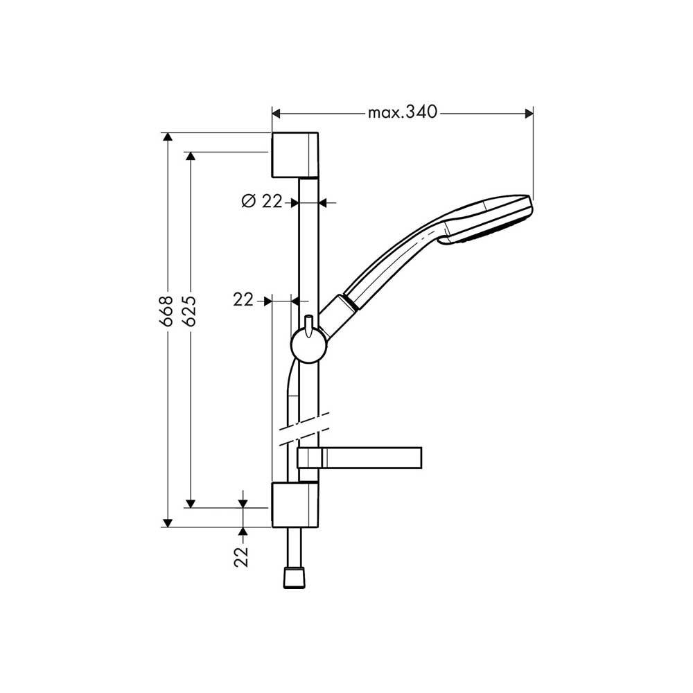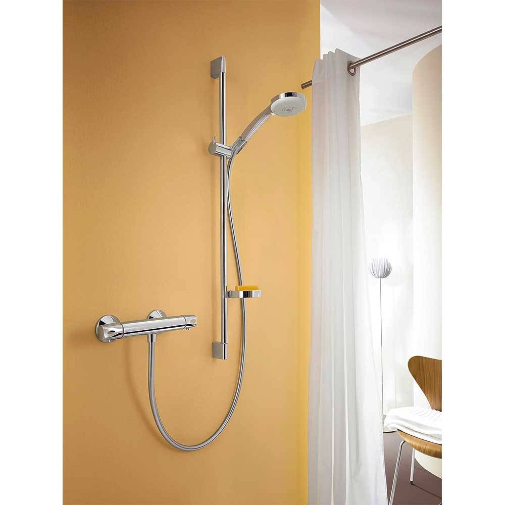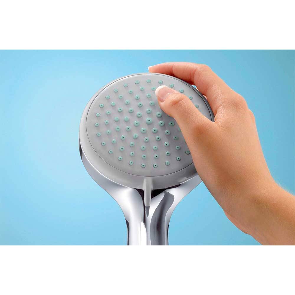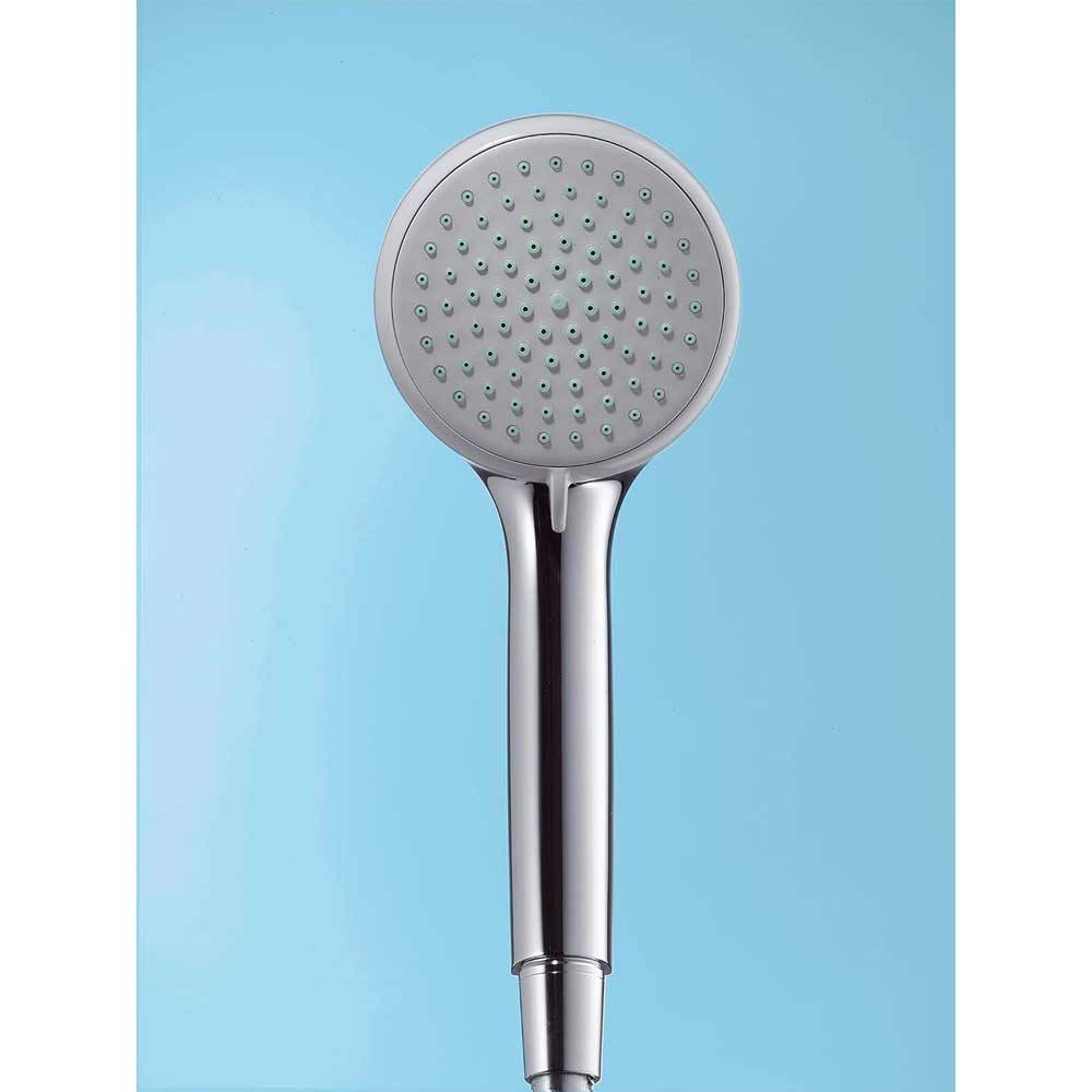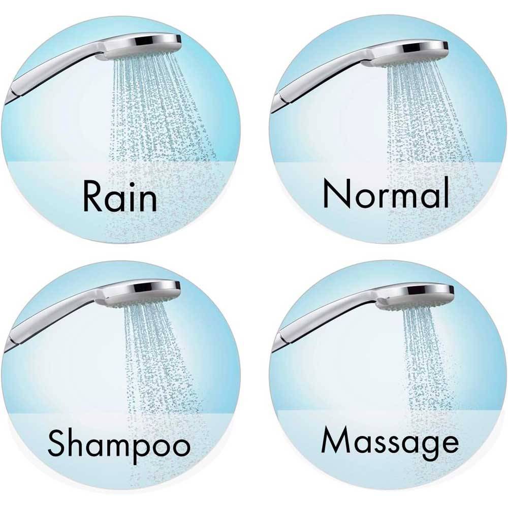 Composto da: - Doccetta; - Asta doccia; - Flessibile doccia; - Cursore; - Portasapone. Diametro doccetta 100 mm. Tipo di getto: Rain, getto shampoo, normale, getto massaggiante. Getto regolabile tramite levetta selettrice. Dado conico lato doccia con cuscinetto per evitare la torsione del flessibile. Cursore regolabile di 90°, verticalmente e orizzontalmente. Portata di 18 l/min. Diametro asta doccia 22 mm. Profilo tubo montante circolare. Supporto parete in plastica. Montaggio a parete: vite.