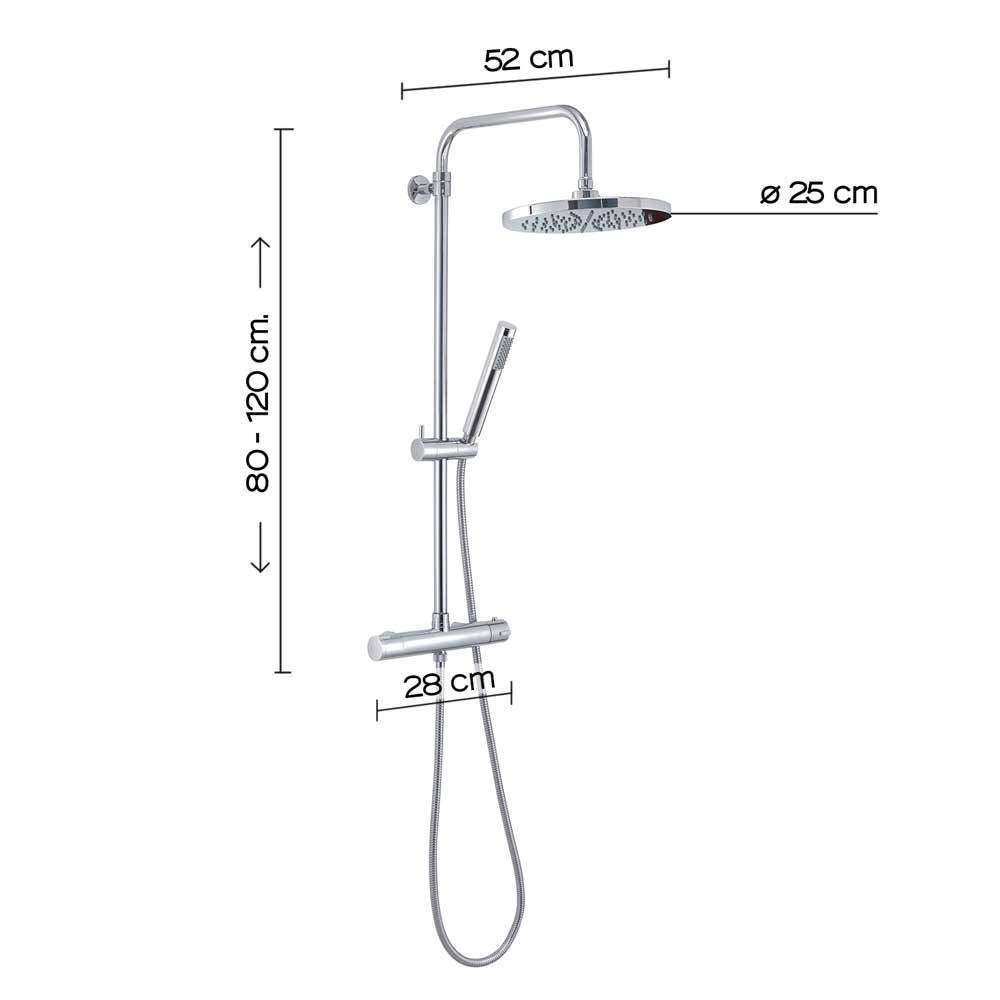 - Colonna doccia estensibile 80-120 cm; - Miscelatore termostato; - Soffione doccia 1 getto Ø 25 cm; - Doccetta 1 getto; - Flessibile inox 150 cm doppia aggraffatura 1/2"x1/2" con attacco conico antitorsione. Dimensioni minime: 28 x 52 x 100 cm