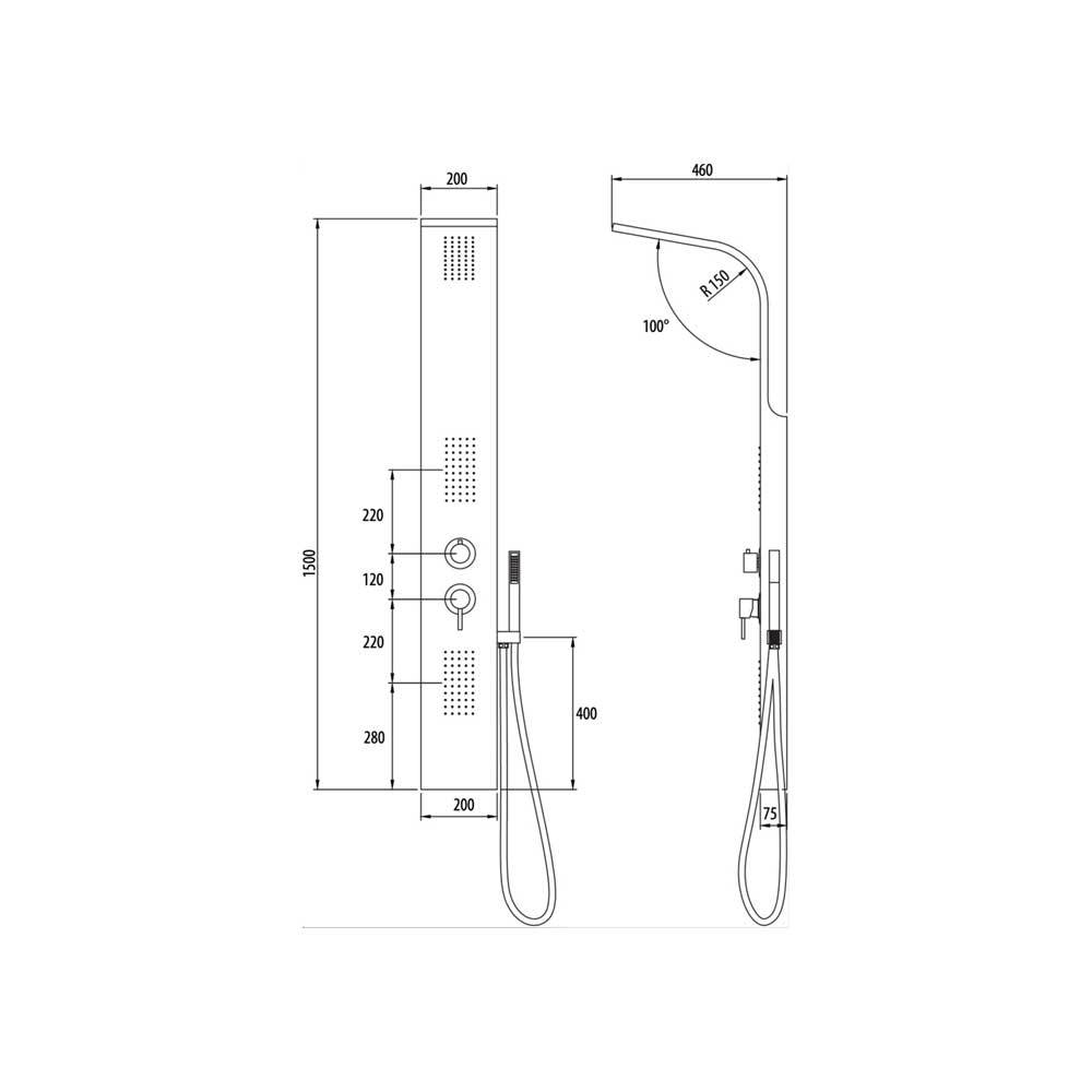Effetto specchio spessore 1 mm; Dimensioni: 1500 x 200 mm. Dotato di: - Doccia in ABS; - Doccetta e set in ABS; - Deviatore e Mixer in Ottone; - Manopole in Zama; - Flessibile in Acciaio lunghezza 150 cm;