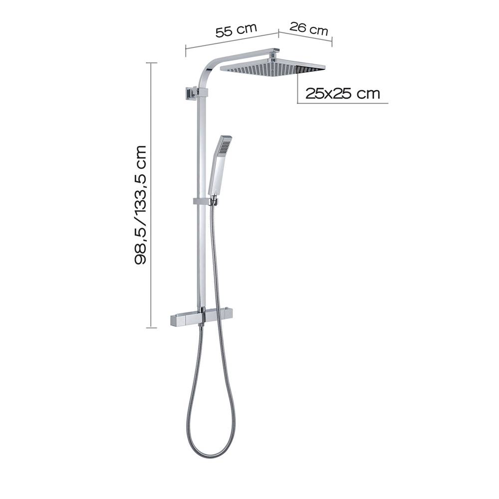- Colonna doccia estensibile 80-120 cm; - Miscelatore termostatico; - Soffione doccia 1 getto 25x25 cm; - Doccetta 1 getto; - Flessibile inox 150 cm doppia aggraffatura 1/2"x1/2" con attacco conico antitorsione. Dimensioni minime: 29 x 40 x 108 cm.