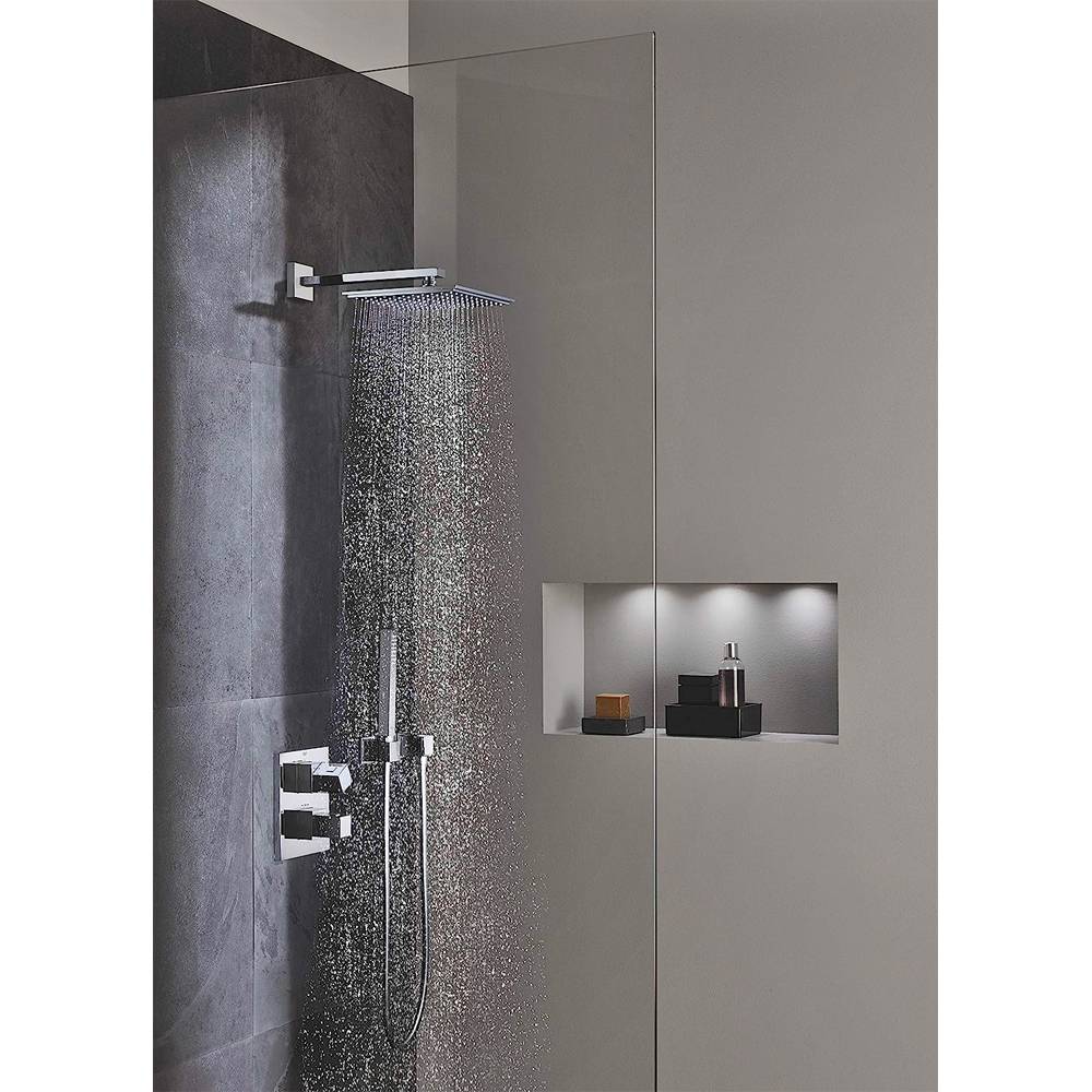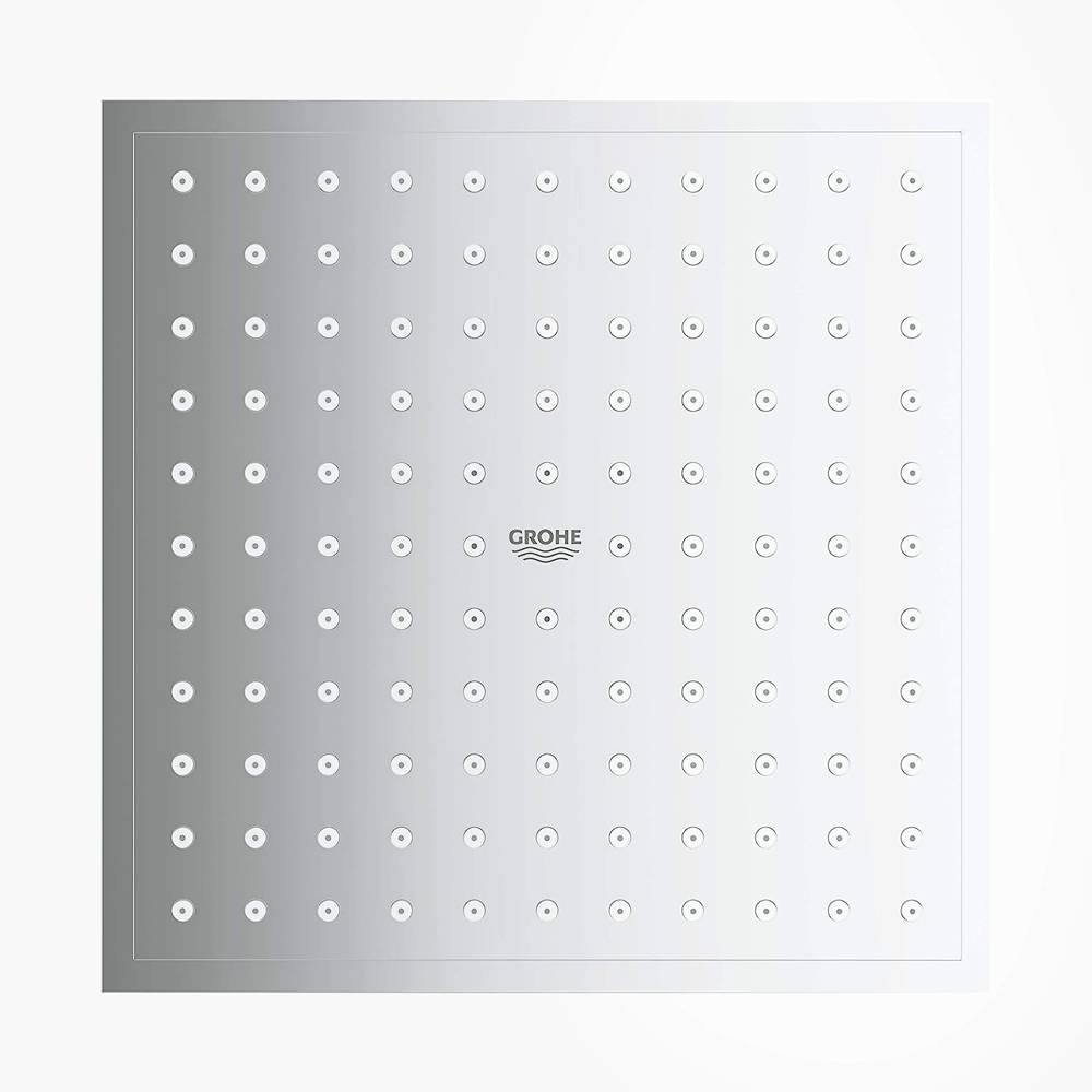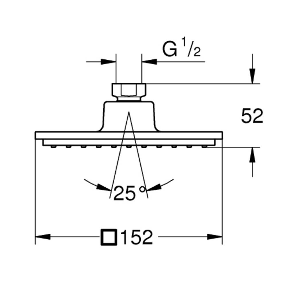 Monogetto: Rain Dimensioni 152 x 152 mm. Raccordo a sfera orientabile. Angolo di rotazione ± 12°. Raccordo da 1/2". GROHE Water Saving (portata limitata a 9,5 l/min). GROHE DreamSpray per un getto sempre perfetto. Sistema anticalcare SpeedClean.