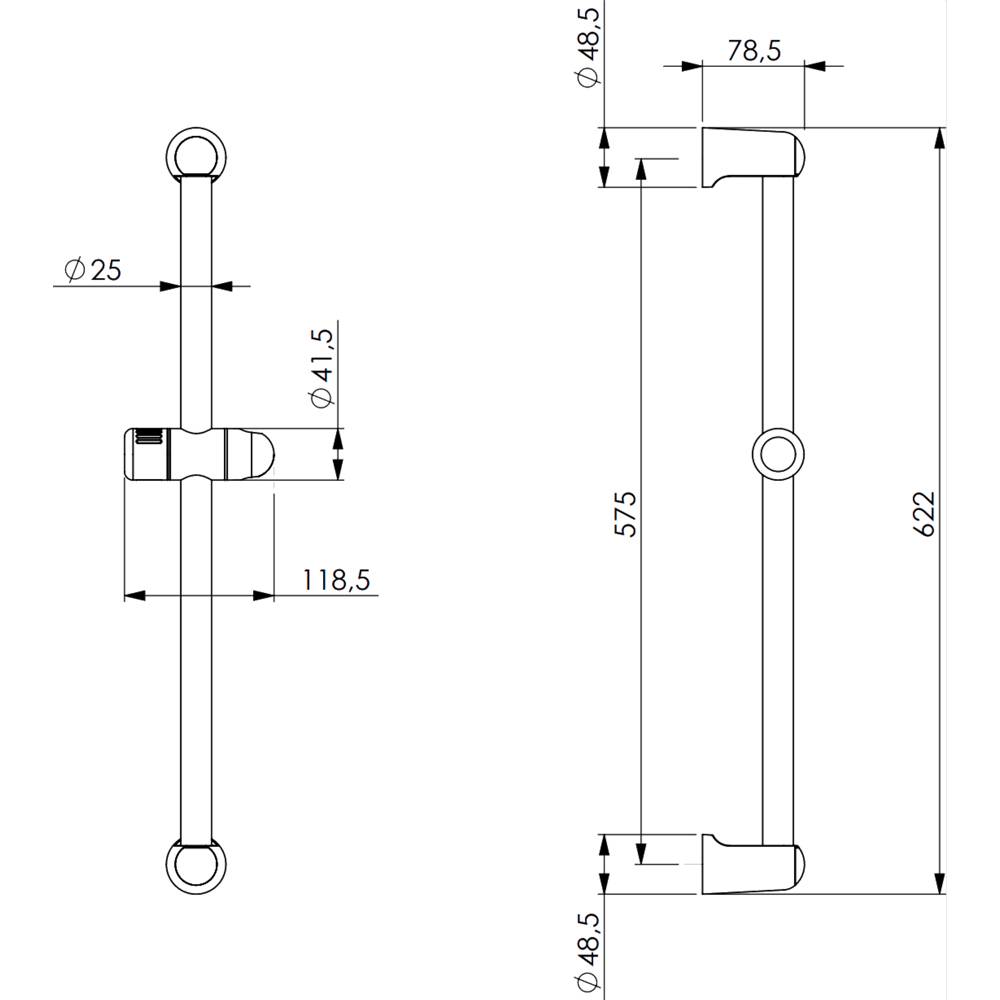 Asta inox cromato Ø 25 mm. Laterali con placchetta grigia e scorrevole in ABS cromato, interasse 577 mm. Fissaggio a 1 vite per ogni laterale.