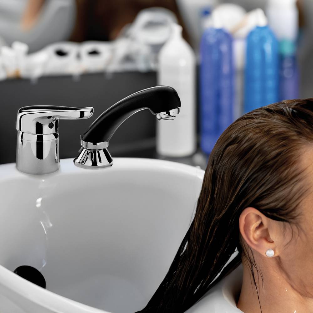 Miscelatore parrucchiere, con doccetta estraibile (monogetto), completo di: - 1 Flessibile Nylon 1/2" G x M15x1 da 150 mm con piombo; - Set 3 flessibili Inox 3/8"G. Cartuccia di ricambio nostro codice 04194.