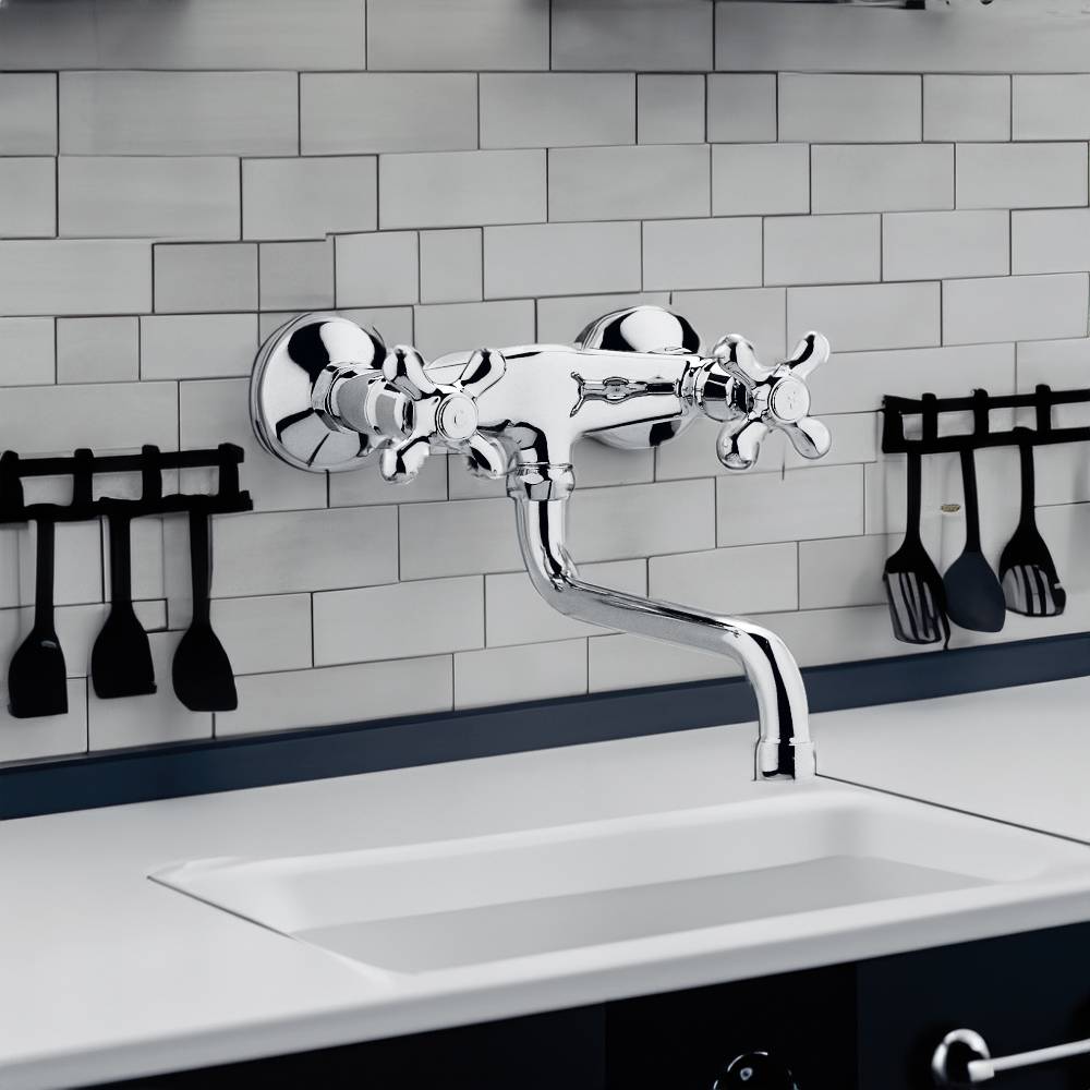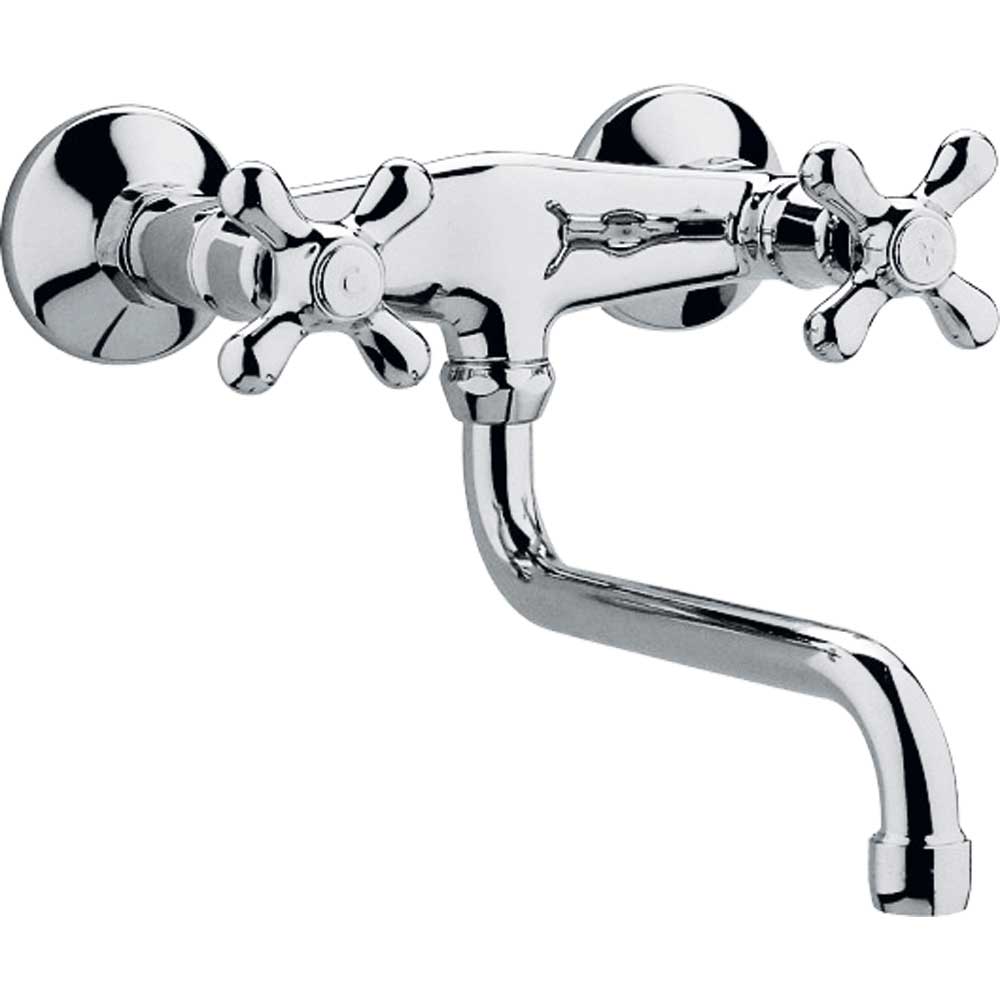 Gruppo lavello a muro, con canna a "S" Ø 18x180 mm, completo di: - Aereatore M22x1"; - Set 2 eccentrici 1/2"x3/4" G e rosoni. Vitoni in ceramica di ricambio nostro articolo 04186.