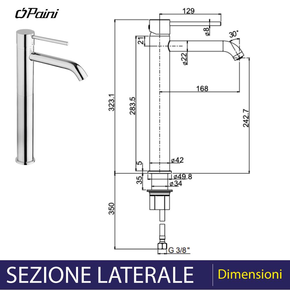 Miscelatore Lavabo versione con canna alta H. 323 mm. Fornito SENZA piletta di Scarico. Cartuccia di ricambio, nostro codice 0422202.