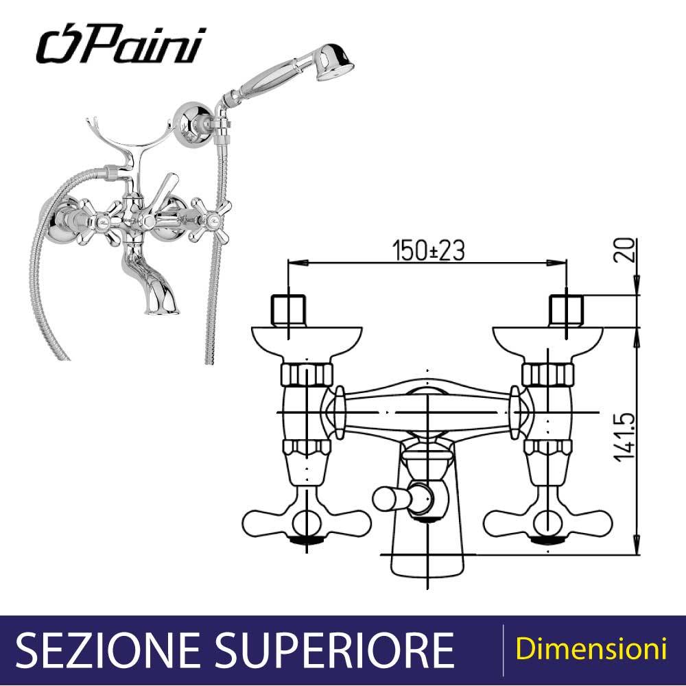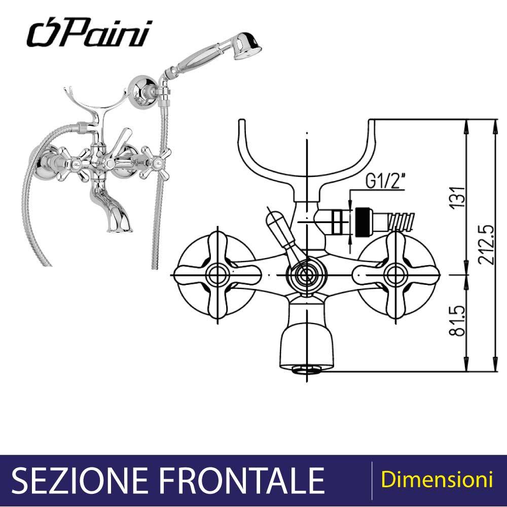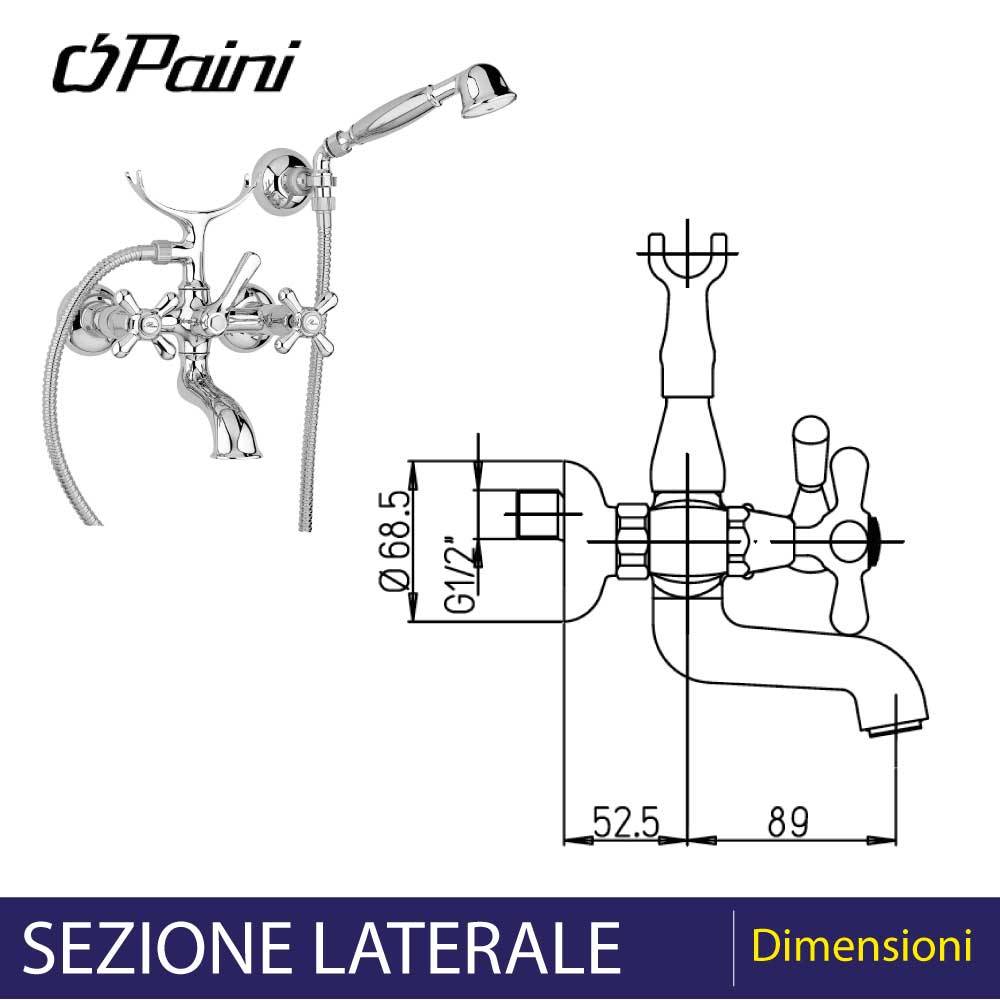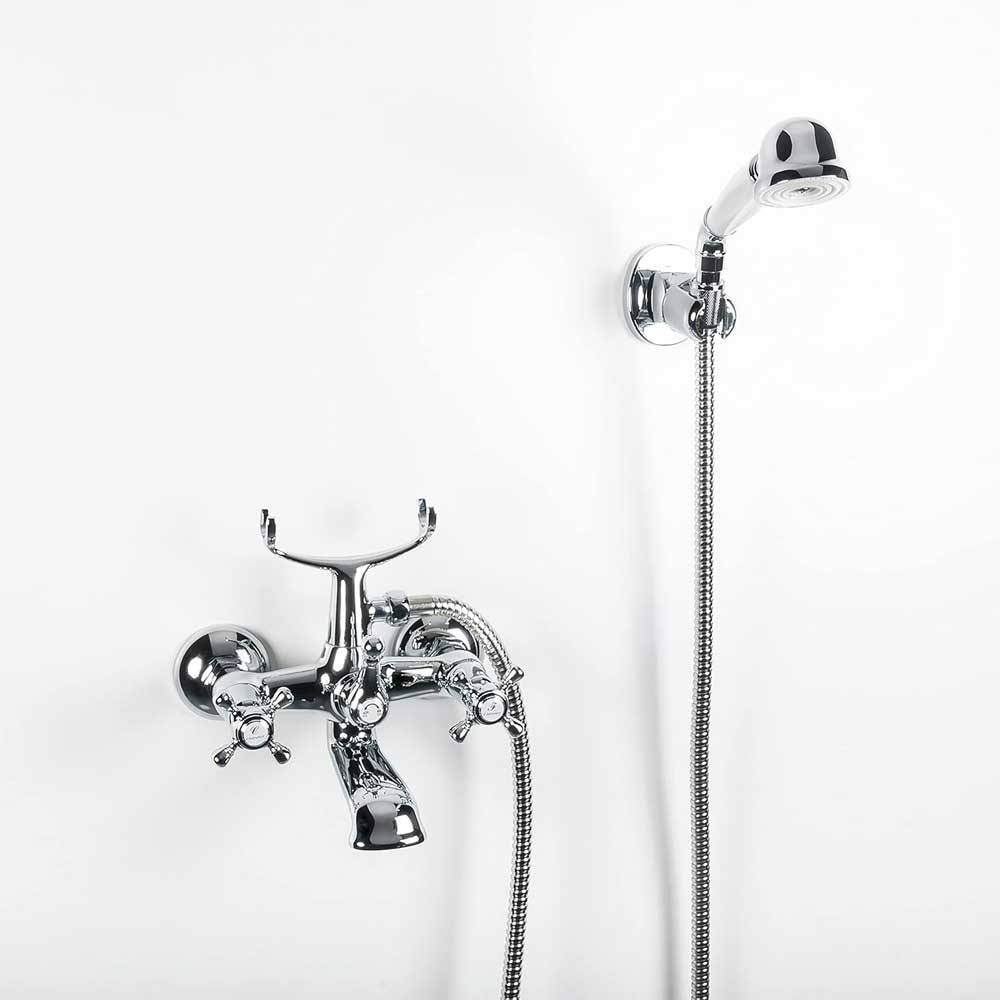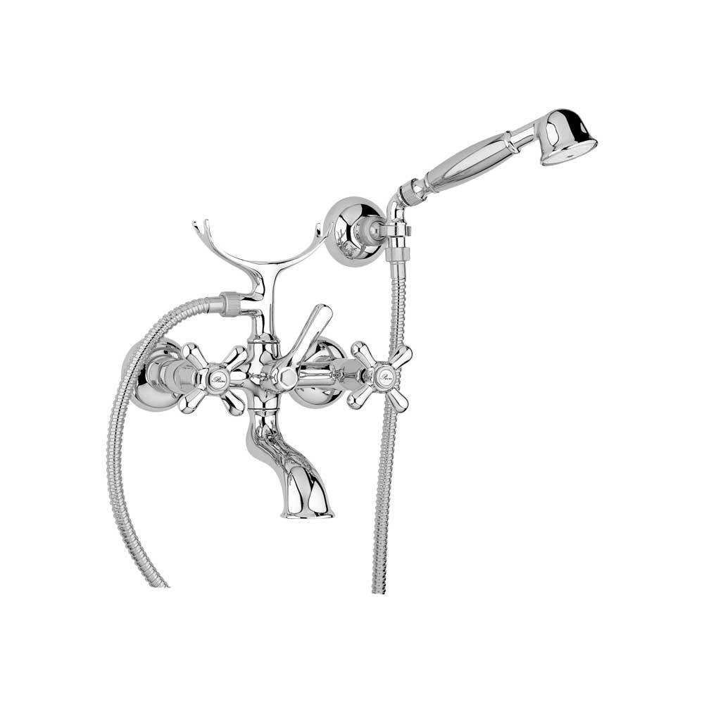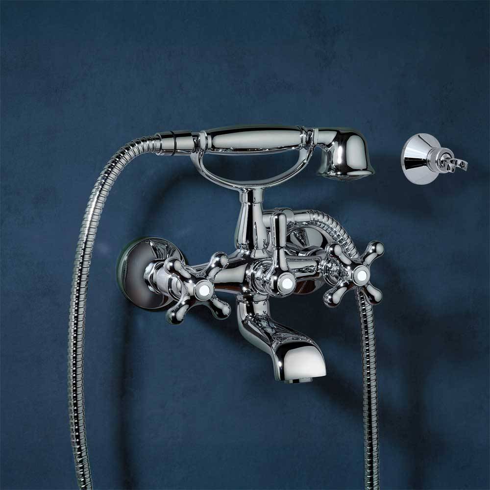 Gruppo vasca, rubinetteria Tradizionale, per installazione esterna alla parete. Finitura: Cromo Con Vitone Ceramicato. Fornito completo di Set Doccia: - Supporto a muro per doccetta, orientbile; - Doccetta Old Style; - Flessibile doccia 150 mm.