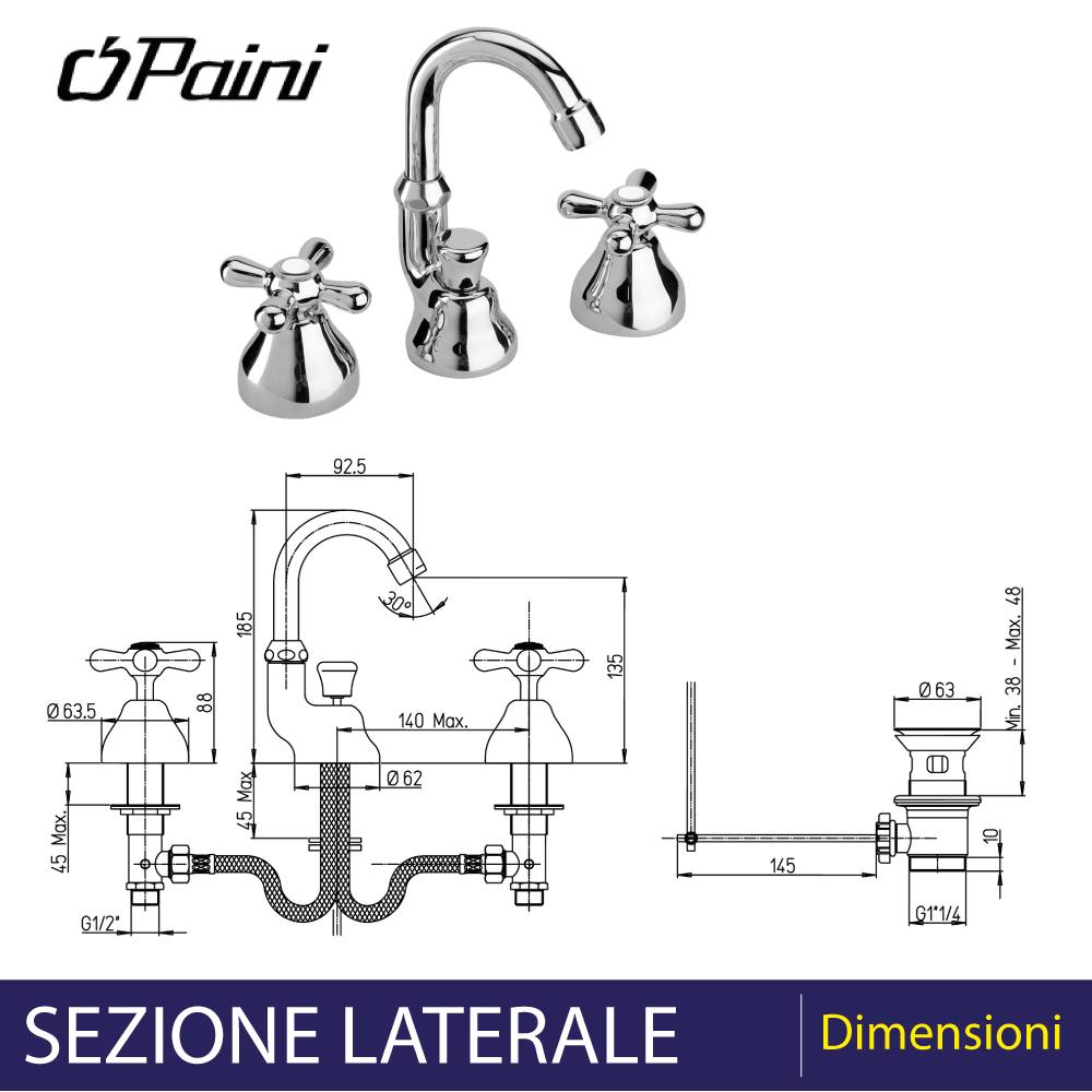 Batteria bidet a 3 fori, con manopole a croce e canna alta orientabile. Finitura: Cromo Stile rubinetteria tradizionale. Fornito completo di Piletta di scarico automatico da 1"1/4. Con Vitone ceramicato.