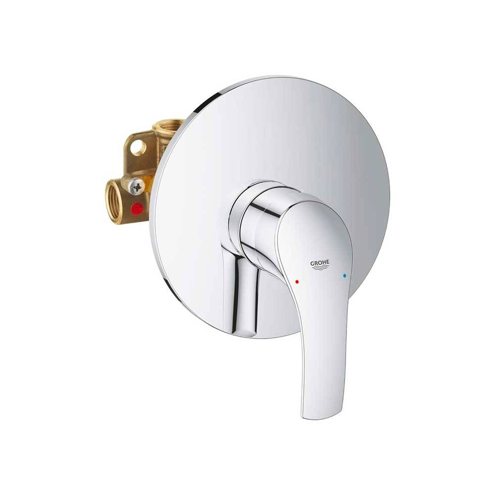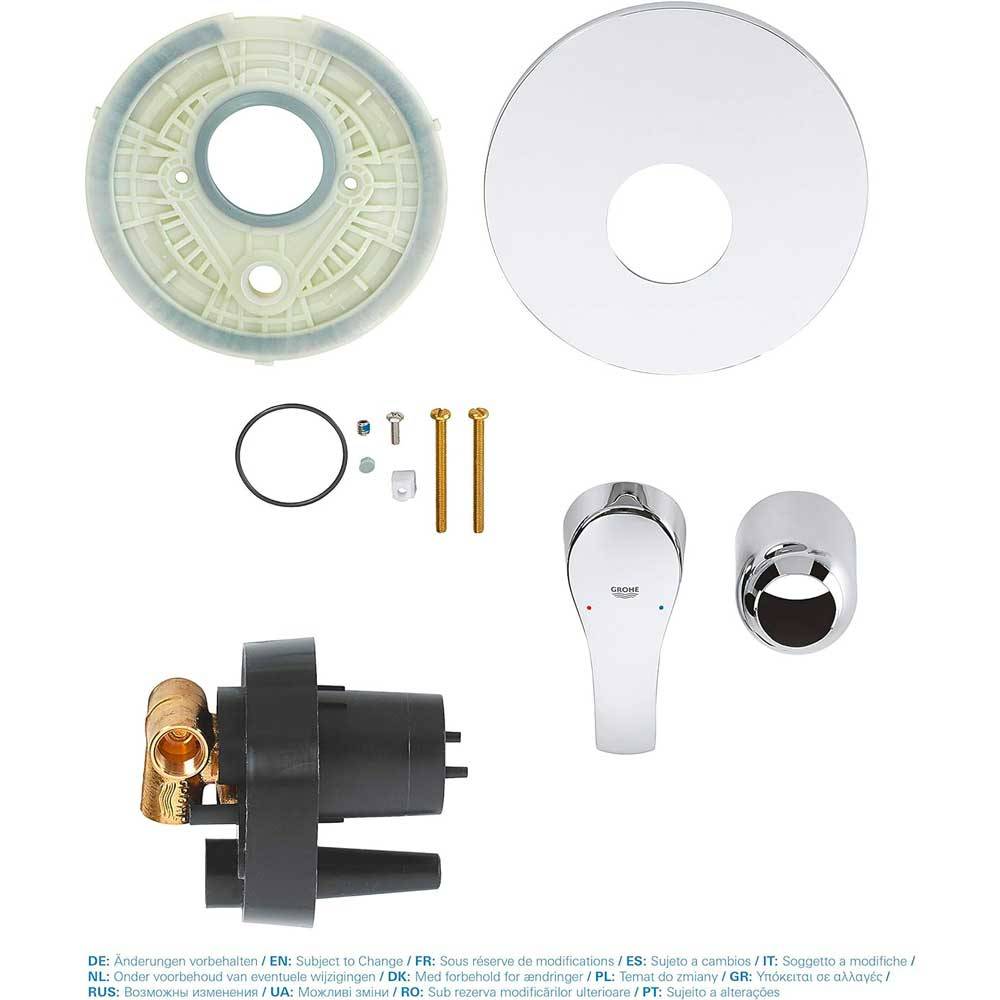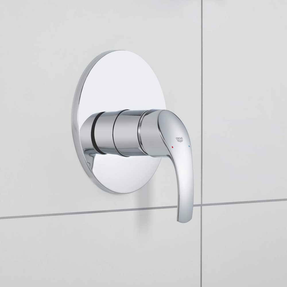 Installazione incassata alla parete. Cartuccia a dischi ceramici da 46 mm con tecnologia GROHE SilkMove. Sistema di installazione GROHE FastFixation. Parte esterna + Corpo incasso. Dotato di serie di limitatore di portata regolabile. Rosone metallico.