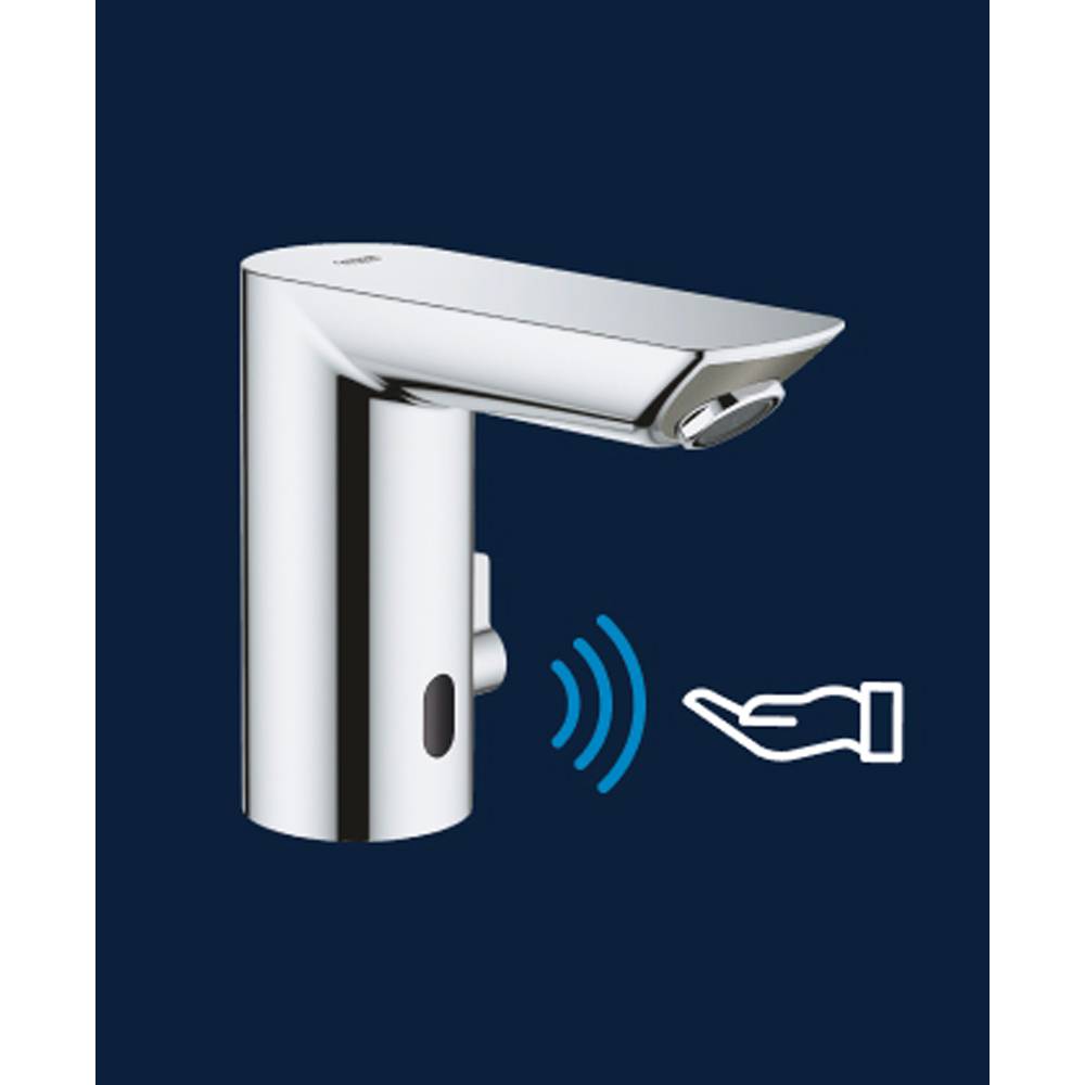 Sensore IR bi-direzionale per impostazione e controllo dei parametri di funzionamento e assistenza. Per acqua fredda o premiscelata. alimentazione batteria litio 6V - tipo CR-P2. Durata della batteria: circa 7 anni (150 cicli al giorno). Con tecnologia GROHE Water Saving per il risparmio idrico. Portata massima (a 3 bar): 5 l/min. Canale interno dedicato al passaggio dell'acqua piombo e nichel free. Corpo realizzato in polimero composito. Con elettrovalvola integrata. batteria esterna. spia di controllo della batteria. 7 programmazioni. sciacquo automatico. disinfezione termica. modalità di pulizia. Marchio CE I gruppo di insonorizzazione secondo DIN 4109. protezione IP 59.