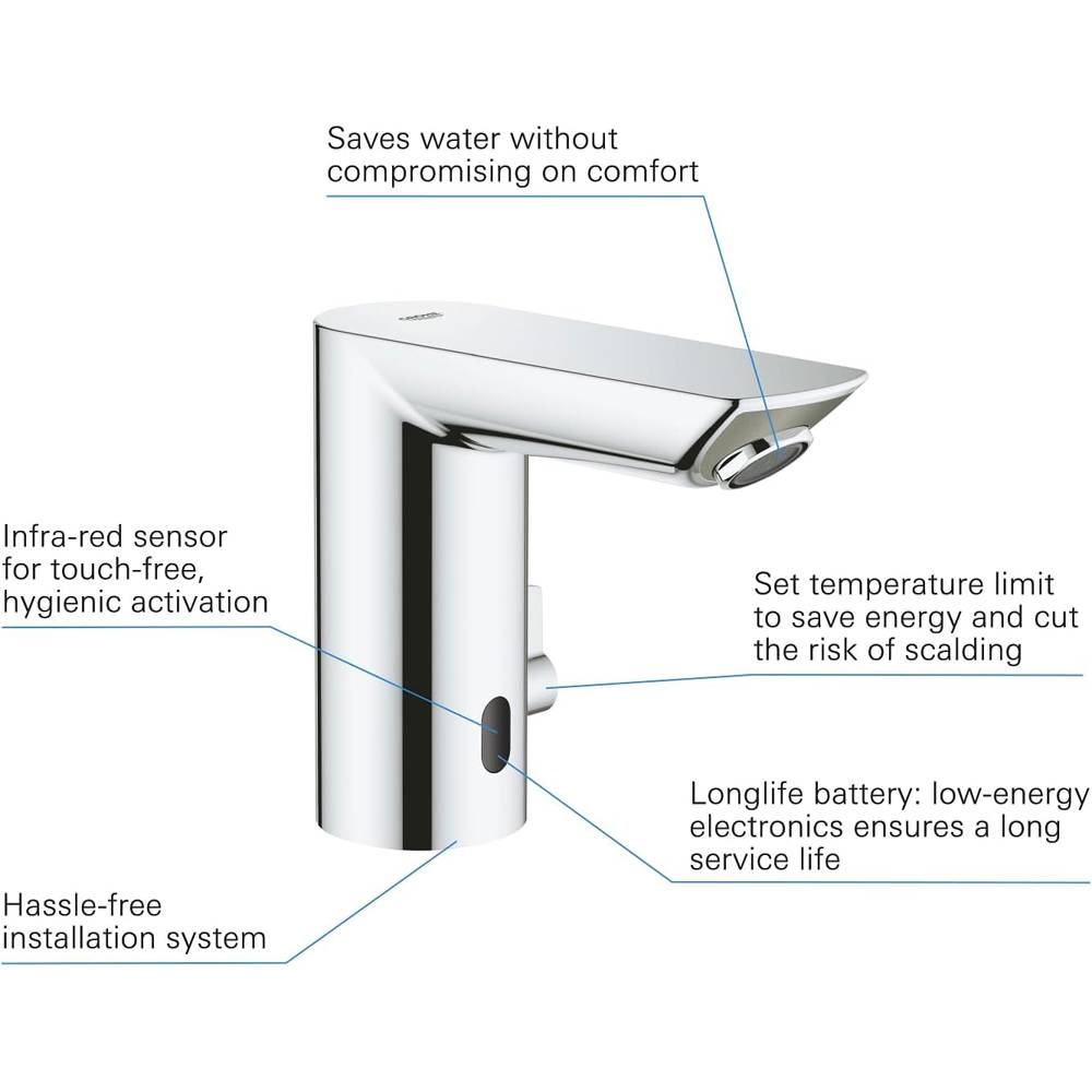 Sensore IR bi-direzionale per impostazione e controllo dei parametri di funzionamento e assistenza. Durata della batteria: circa 7 anni (150 cicli al giorno). Con tecnologia GROHE Water Saving per il risparmio idrico. Portata massima (a 3 bar): 5 l/min. Canale interno dedicato al passaggio dell'acqua piombo e nichel free. Corpo realizzato in polimero composito. Con raccordi flessibili. Valvola di ritegno. Con elettrovalvola integrata. batteria esterna. spia di controllo della batteria. 7 programmazioni. sciacquo automatico. disinfezione termica. modalità di pulizia. Marchio CE. I gruppo di insonorizzazione secondo DIN 4109. protezione IP 59.