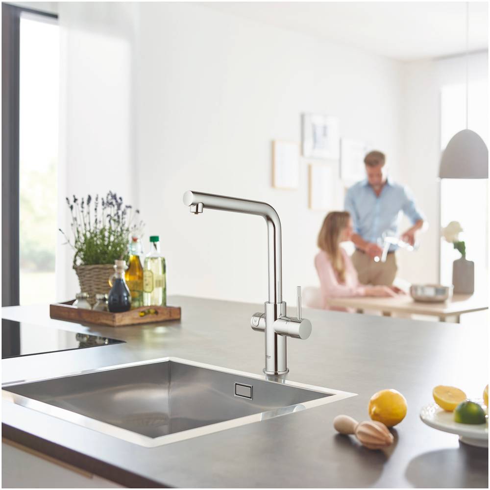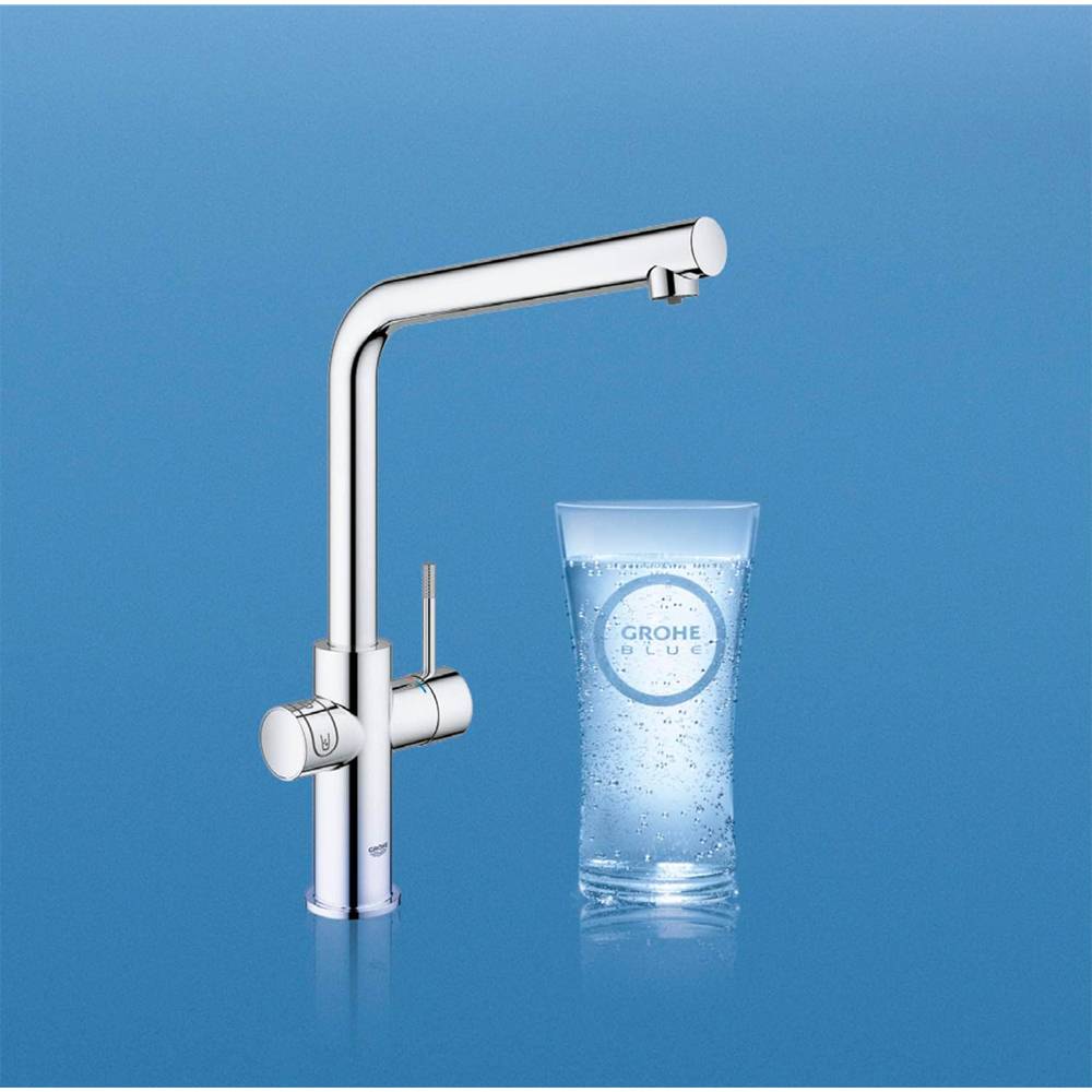 Il kit comprende: - GROHE Blue Home miscelatore monocomando per lavello con sistema filtrante dell'acqua; - bocca "L" girevole angolo di rotazione 150°; - Pulsante a pressione per 3 tipologie di acqua fresca e filtrata: acqua naturale fresca, acqua leggermente frizzante e frizzante fredda - Cartuccia a dischi ceramici da 28 mm con tecnologia GROHE SilkMove - 2 canali di erogazione dell'acqua separati per acqua corrente miscelata e acqua filtrata - GROHE Blue Home refrigeratore erogazione di circa 6 litri di acqua frizzante e fredda alla minima temperatura ogni ora (1,5 ogni 20 minuti più 1,5 contenuto di partenza nel refrigeratore) GROHE Blue refrigeratore 180 Watt, 230 V, 50 Hz livello sonoro in standby 44 dB(A) protezione IP 21 marchio CE E' obbligatorio realizzare sul pianale della cabina lavello i fori di ventilazione per il frigorifero seguendo le istruzioni allegate nei TPI set-up del software e monitoraggio della capacità di filtro e bombola di CO² gestibilii tramite l'App GROHE Watersystems notifiche push per avvisare della ridotta capacità del filtro e della bombola di CO² con Bluetooth 4.0 * e interfaccia WIFI per comunicazione dati wireless per sistemi Apple** e Android copertura Bluetooth (10 m) variabile a seconda dei materiali e dei muri presenti tra il trasmettitore e il ricevitore GROHE Blue testata filtro GROHE Blue filtro a 5 fasi taglia S capacità media 600 l con durezza acqua fino a 20°dKH o un anno di utilizzo (40 404 001) per migliorare il sapore e la qualità dell'acqua per regioni con durezza dell'acqua superiore a 9 ° dKH filtri compatibili: - filtro a 5 fasi taglia S, capacità media 600 l con durezza acqua fino a 20 dKH o un anno di utilizzo (40 404 001) - filtro a 5 fasi taglia M, capacitàmedia 1500 l con durezza acqua fino a 20 dKH o un anno di utilizzo (40 430 001) - filtro ai carboni attivi, capacità media 3000 l o un anno di utilizzo (40 547 001) -filtro Magnesium + Zinco, capacità media 400 l con durezza acqua fino a 17 dGH o un anno di utilizzo (40 691 002) - filtro Ultrasafe, capacità media 3000 l o 6 mesi di utilizzo (40 575 002) GROHE Blue bombola CO² da 425 gr Requisiti Apple iPhone con versione iOS 14.0 o superiori Requisiti Apple Android smart phone con versione Android 10.0 o superiori I dispositivi mobili e la App GROHE Watersystems*** non sono inclusi nella fornitura e possono essere acquistati in negozi autorizzati o scaricati su iTunes o Google Playstore.* Il marchio e il logo Bluetooth sono marchi registrati di proprietà di Bluetooth SIG , Inc. e qualsiasi utilizzo di tali marchi da parte di Grohe AG è autorizzato con licenza. Altri marchi e nomi commerciali sono di proprietà dei rispettivi titolari.**Apple, il logo Apple, iPod, iPod Touch, iPhone e iTunes sono di proprietàesclusiva di Apple Inc, marchio registrato negli USA e altri Paesi. Apple non èr esponsabile per il funzionamento di questo dispositivo o della sua compatibilitàcon gli standard di sicurezza e regolatori.*** Disponibile gratuitamente su iTunes app o Google Play store. Questo prodotto include un articolo che è classificato come sostanza pericolosa. Maggiori informazioni nella scheda di sicurezza. È possibile scaricare i dati di sicurezza su: www.grohe.com/safety-data-sheets/