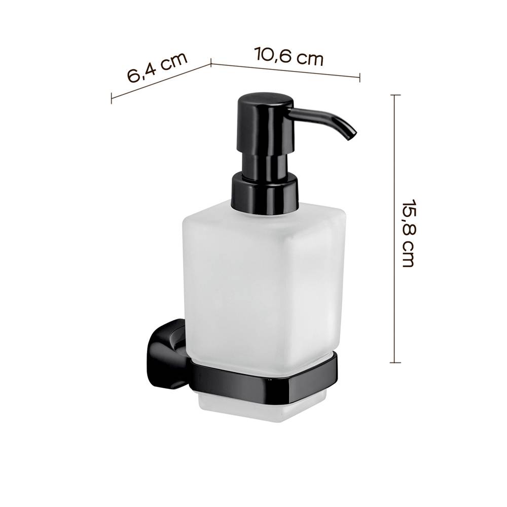 Con erogatore in Plastica. Materiale: Acciaio Inox, Cromall e vetro satinato. Dimensioni: 6,4 x 10,6 x 15,8 cm. Carico testato 7 Kg.