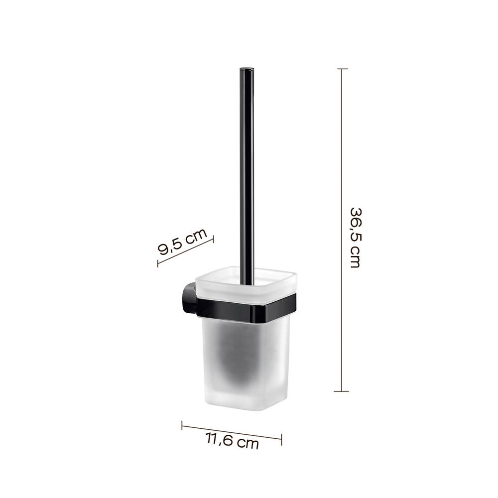 Scopino con ciuffo in setole nero e tazza interna estraibile idoneo ad una facile pulizia. Materiale: Acciaio Inox, Cromall e Vetro Satinato. Dimensioni: 9,5 x 11,6 x 36,6 cm